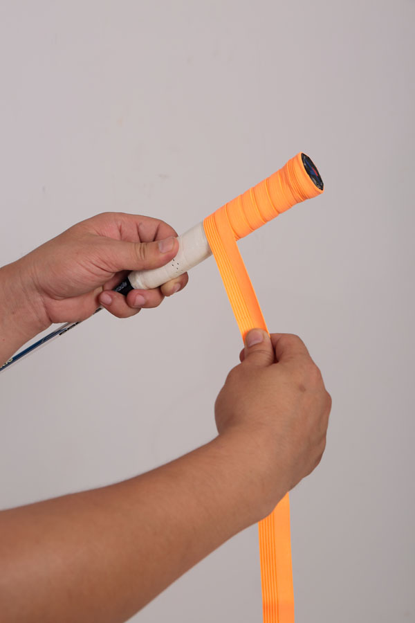 4、鑒于有雙手握拍的擊球方式,所以在纏繞吸汗帶時盡量把整個手柄覆蓋住,這樣使其才有足夠的作用空間面積給兩只手。若吸汗帶仍有多余部分可以用剪刀剪掉就可以了。
